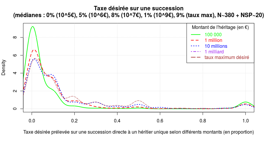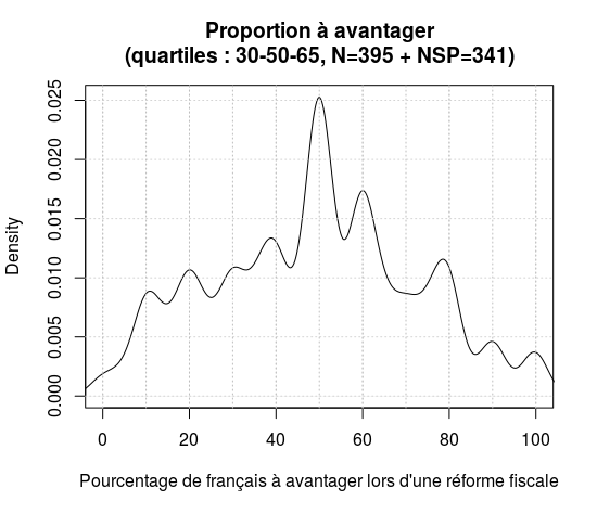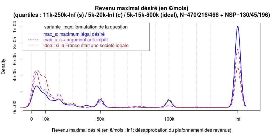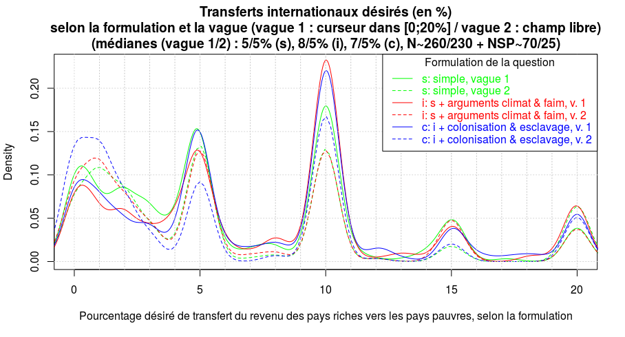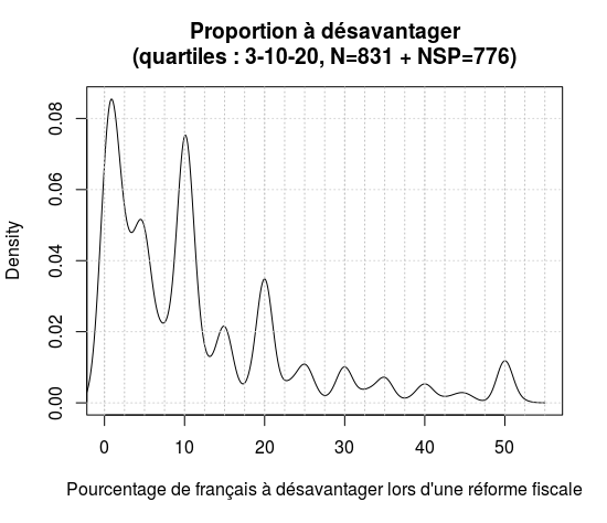 Les réponses médianes suivant les différentes formulations sont (cf. le quatrième graphique) : 4,9% (Fiscalité, s), 9,5% (Politique, s), 9,8% (Fiscalité, i), 7% (Politique, i), 6% (Fiscalité, c) et 9% (Politique, c).