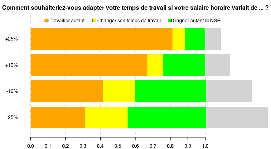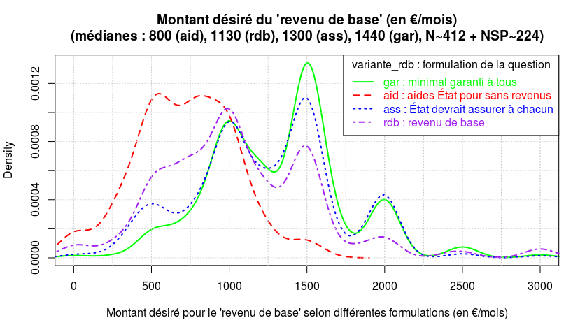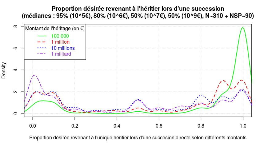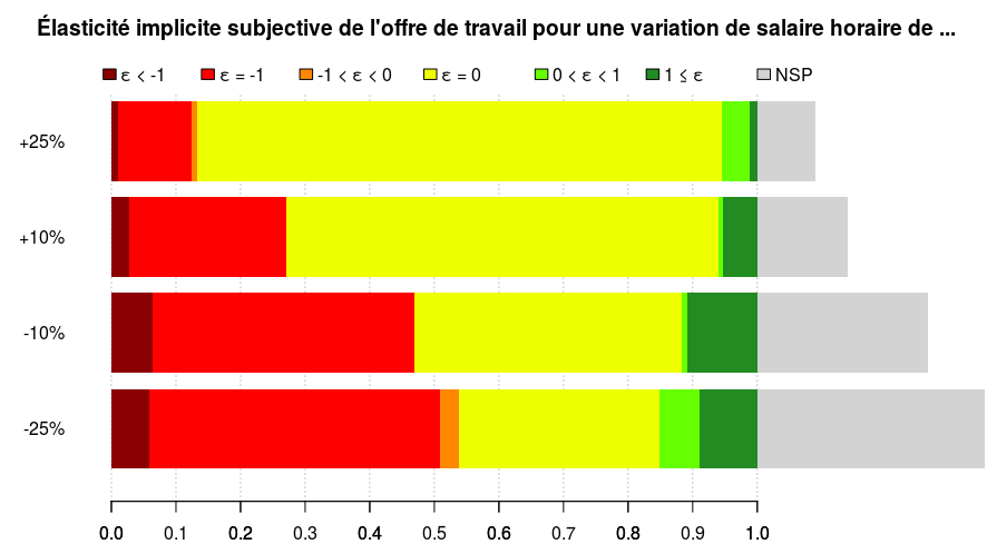 Les effets des formulations sont significatifs (au seuil de 5%) : les réponses sont plus élevées (de 2,1% en médiane) dans le cas du champ libre (où la proportion de non-réponses induite par l'absence de case "NSP" est de 10%, contre 24% dans la version avec curseur).