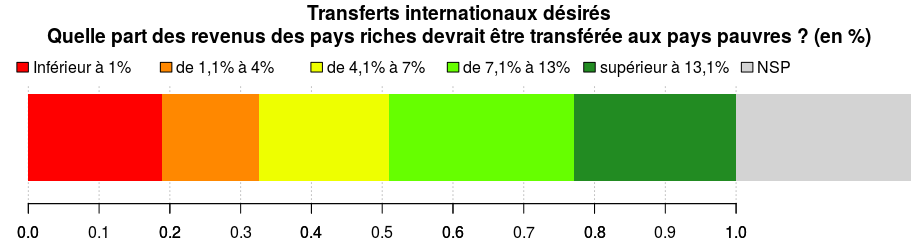 Les répondants estiment que l'aide publique au développement est efficace, et importante. Enfin, on retrouve l'ordre de grandeur d'un transfert de 5% du revenu des pays riches dans une question sur l'augmentation de prix acceptée pour le commerce équitable.